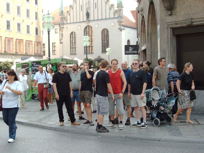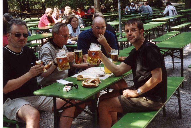 Unter der fachmännischen Leitung von Ernst Bauder, ausgestattet mit einem Stadtplan von München, wurde zu Fuß das Hotel (Stil Jugendherberge für nicht mehr Junge, aber preiswert und mitten in der Stadt) aufgesucht. Direkt im Anschluss an die Zimmervergabe ging es dann auch schon los. Die Zeit reichte gerade noch so aus, um kurz vor 12.00 Uhr die erste Weißwurst auf dem Viktualienmarkt zu „zuzeln“ und dazu standesgemäß ein bis mehrere Weißbier zu genießen.