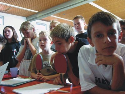 Geländespiele und Kegeln am Samstag rundeten das Programm ab. Wie konzentriert die SKG-Schüler trainiert hatten zeigte sich am Sonntag morgen. Das Ranglistenturnier stand auf einem wesentlich höheren Niveau als noch im Vorjahr. An diesem Turnier konnten 16 Kinder teilnehmen, von denen die Folgenden unter die Top Ten kamen: 1. Nico Perra, 2. Mario Beer, 3. Cora Kadel, 4. Marcel Gottschling, 5. Michi Kadel, 6. Michael Schäfer, 7. Christian Müller, 8. Isabel Schaab, 9. Nicola Kadel, 10. Manuel Groffmann. Die Kinder, die nicht an diesem Trunier teilnahmen, spielten sich umgehend in die Rangliste ein. Die Eltern, die sich durch tatkräftige Unterstützung beim Reinigen der SKG Halle sowie Kuchen und Salatspenden am Erfolg des Camps wesentlich beteiligt hatten, sahen an den müden Augen einzelner Kinder deutlich, dass der Sonntag Nachmittag dringend benötigt würde, um sich vor einer langen Schulwoche noch etwas zu regenerieren. Das Trainingscamp hat jedoch bestimmt dazu beigetragen, dass mit viel Spaß Konzentrationsfähigkeit und Leistungsbereitschaft der Teilnehmer weiter gesteigert wurden. Das enge Zusammenleben in der Halle, rund um die Uhr, förderte zudem die Fähigkeit zum sozialen Miteinander und das Zusammengehörigkeitsgefühl der Gruppe. Aus diesem Grund wird dieses Trainingscamp auch im Jahr 2004 seine Fortsetzung finden.